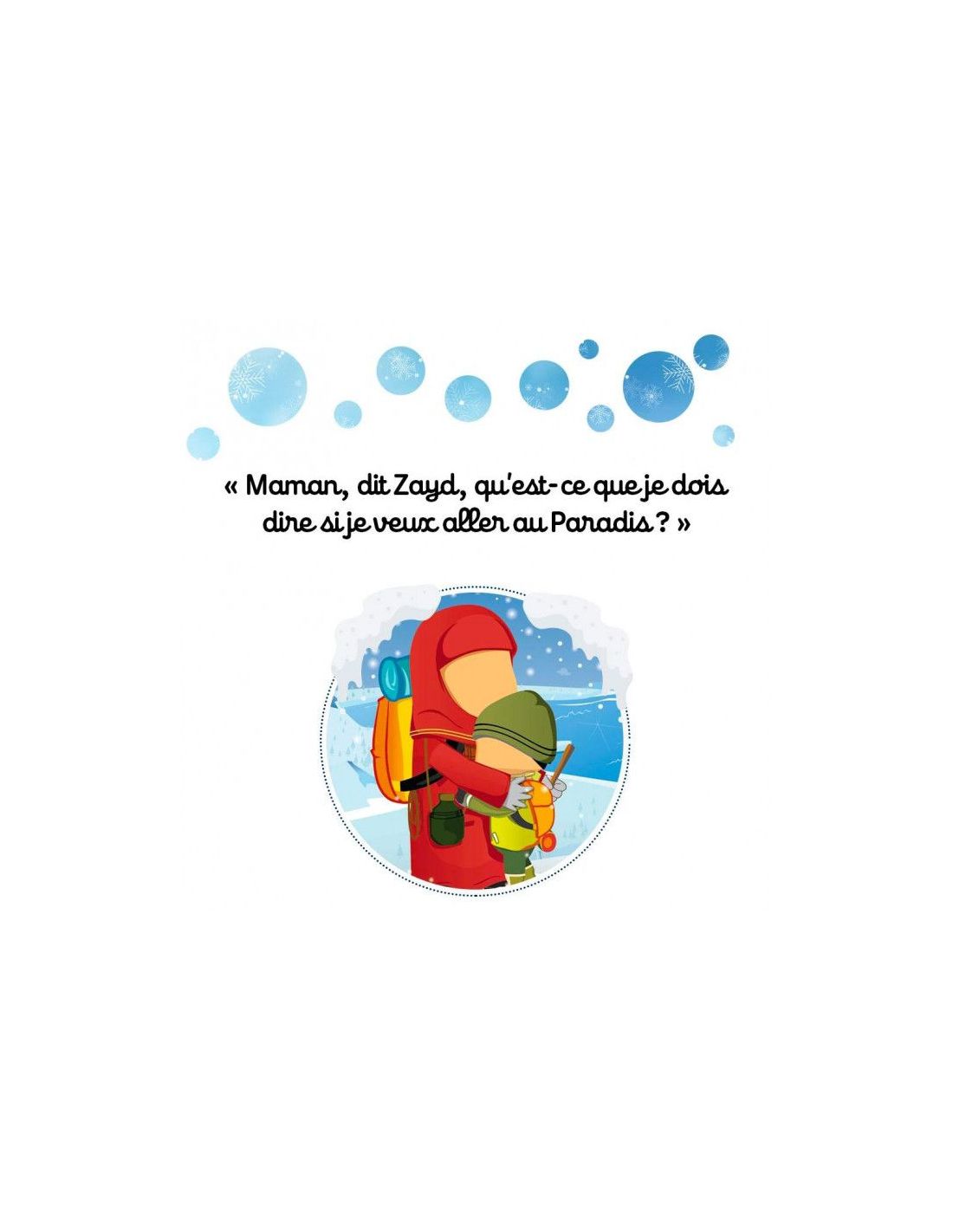 Alors qu'ils gravissent un mont enneigé, Zayd pose une intriguante question à maman "Maman, qu'est-ce qu'il faut dire pour aller au paradis ?" Tout au long de l'histoire, Zayd essaie de répondre à sa propre question sans réellement y parvenir. Sa maman l'accompagne dans ses efforts, lui enseigne de nouvelles invocations, mais veille à ne pas lui révéler la réponse. Zayd parviendra-t-il à trouver la bonne réponse. Et cette réponse s'averra-t-elle aussi simple que ce qu'il espérait ? Il vous faudra accompagner Zayd et sa maman dans leur voyage pour le découvrir ...