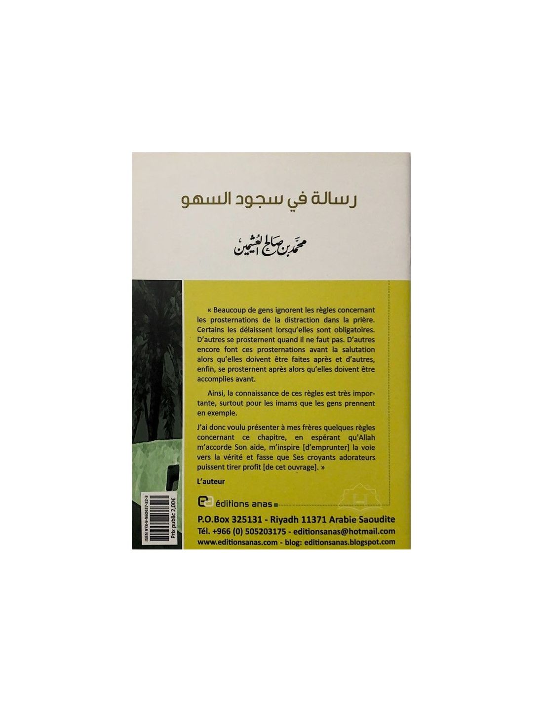 Les Prosternations de la Distraction [...] L'auteur a voulu nous présenter quelques règles concernant ce chapitre, en espérant que chacun d'entre nous puisse éviter de faire le moins de fautes concernant la prière tout en prenant connaissance de ces règles fondamentales. Les règles et les exemples concernant l'ajout ou la diminution involontaire dans la prière et les manières de compenser la prière défectueuse. Beaucoup de gens ignorent les règles concernant les prosternations de la distraction dans la prière. Certains les délaissent lorsqu'elles sont obligatoires. D'autres se prosternent quand il ne faut pas. Ainsi, la connaissance de ces régles est très importante surtout les imams que les gens prennent en exemple.